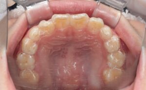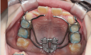 治療途中の小児矯正の症例です。あごの成長を利用しながら、拡大装置で歯が並ぶスペースを広げ、